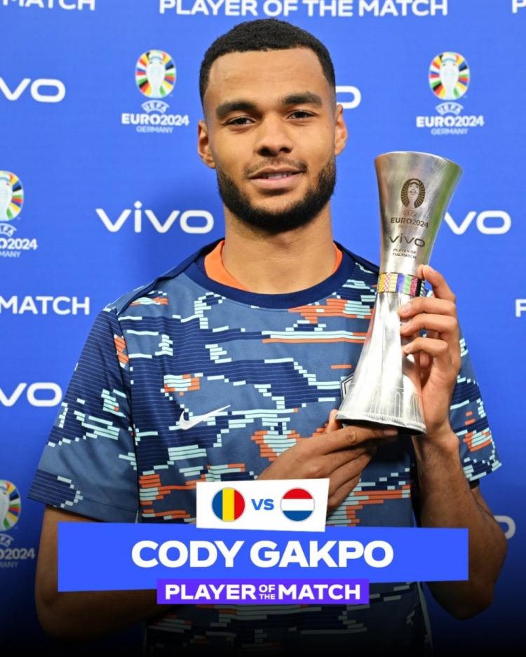 7月3日讯 欧洲杯1/8决赛,荷兰3-0击败罗马尼亚晋级8强,传射建功的加克波赛后当选全场最佳球员。