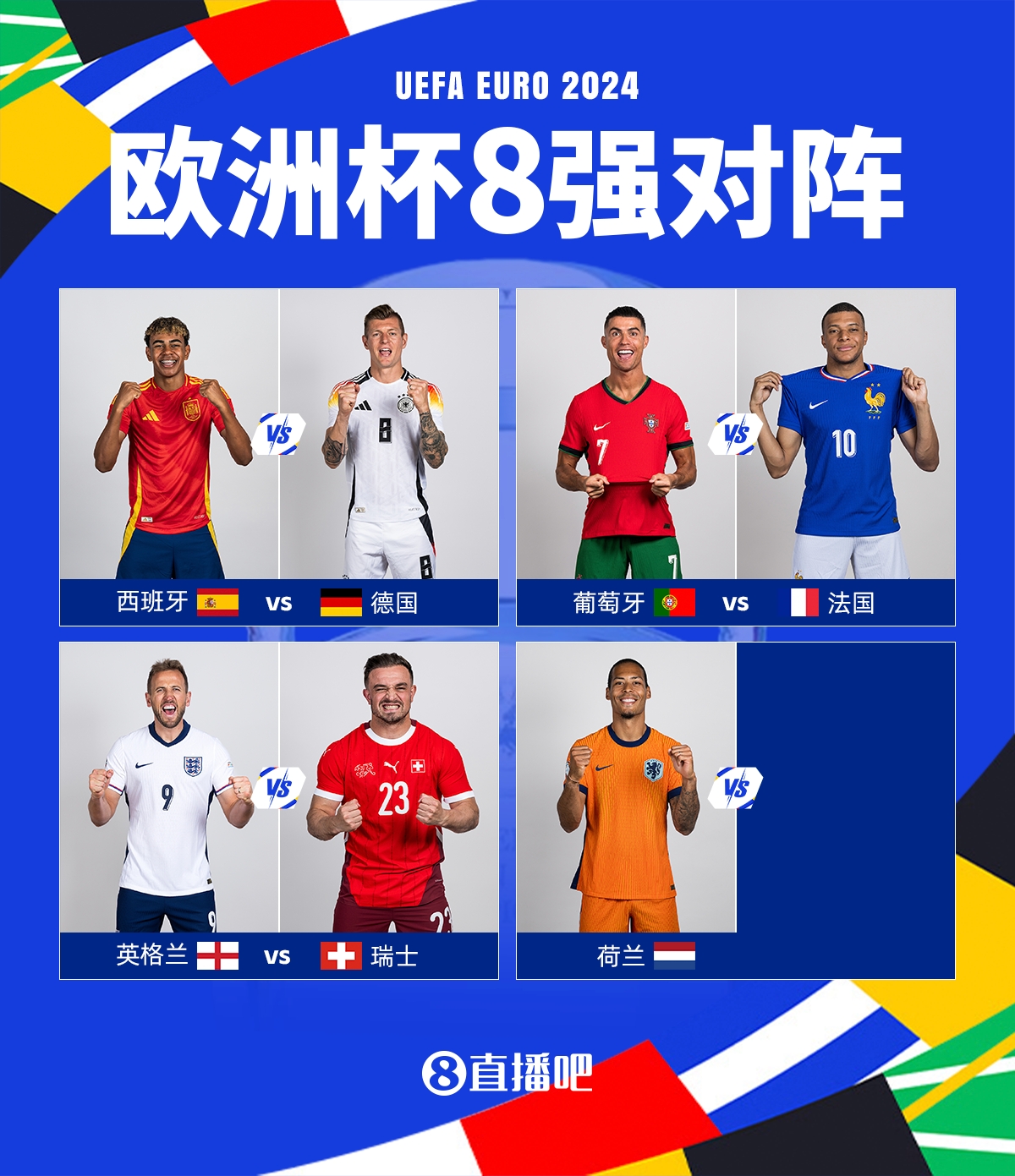 至此,欧洲杯8强已经出炉7席。上半区西班牙、德国、葡萄牙、法国豪强林立,下半区瑞士、英格兰、荷兰已经蓄势待发。