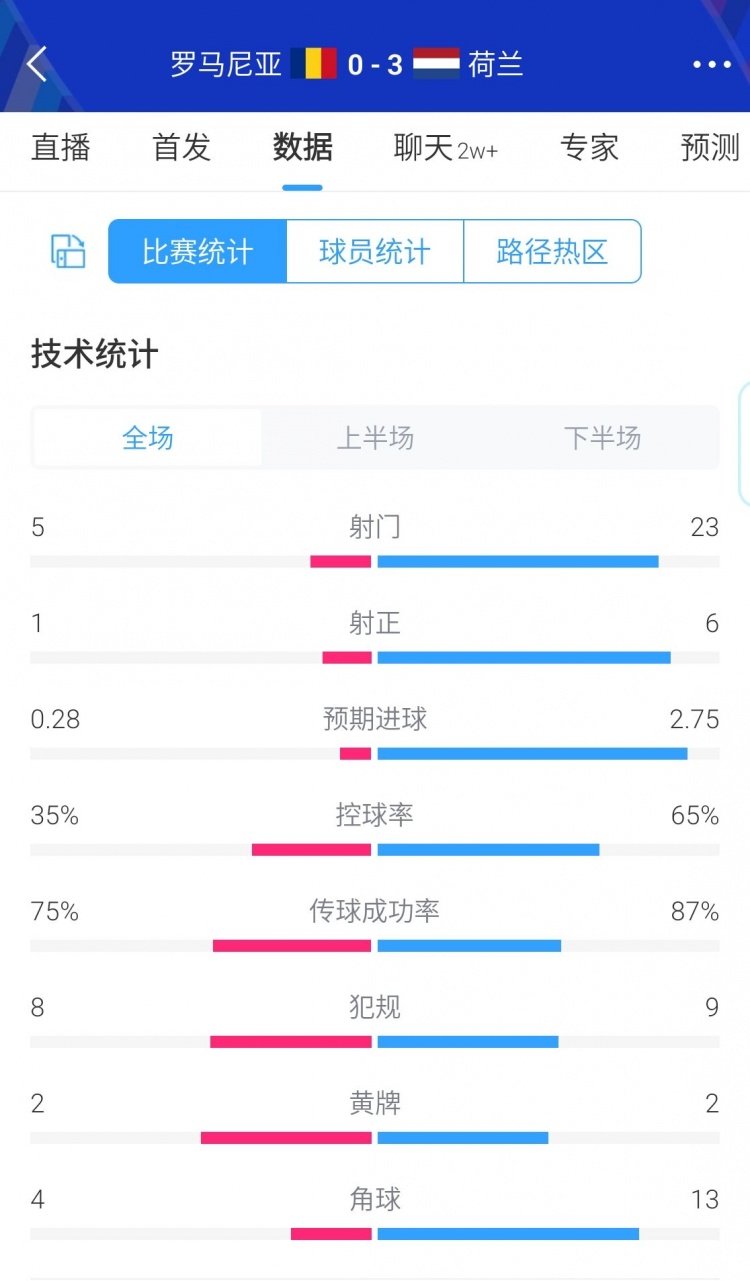 好看!荷兰3-0罗马尼亚全场数据:射门23-5 预期进球2.75-0.28