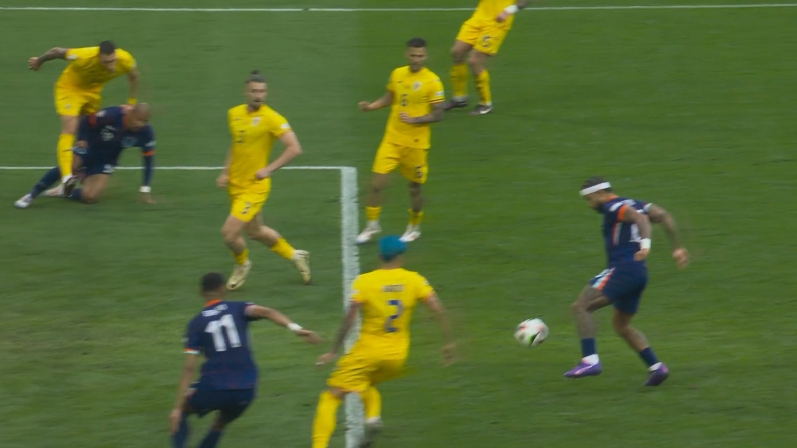 07月03日讯 荷兰vs罗马尼亚第54分钟,邓弗里斯下底倒三角造险,马伦德佩连续打门都没打正!最终皮球被罗马尼亚门将没收。