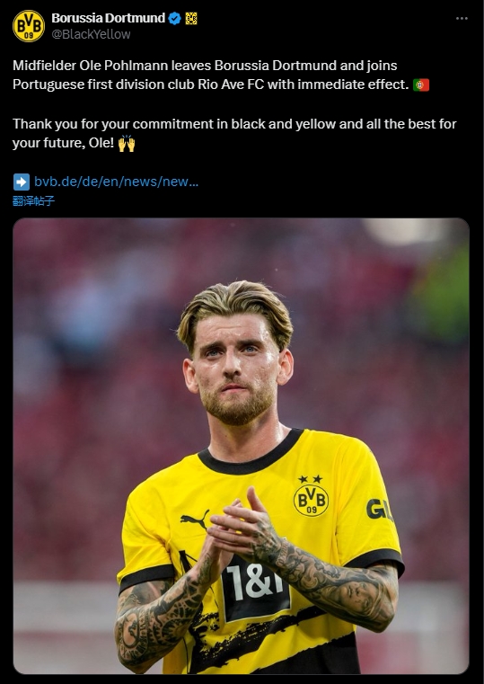 官方:多特23岁德国中场奥莱-波尔曼加盟葡超里奥阿维