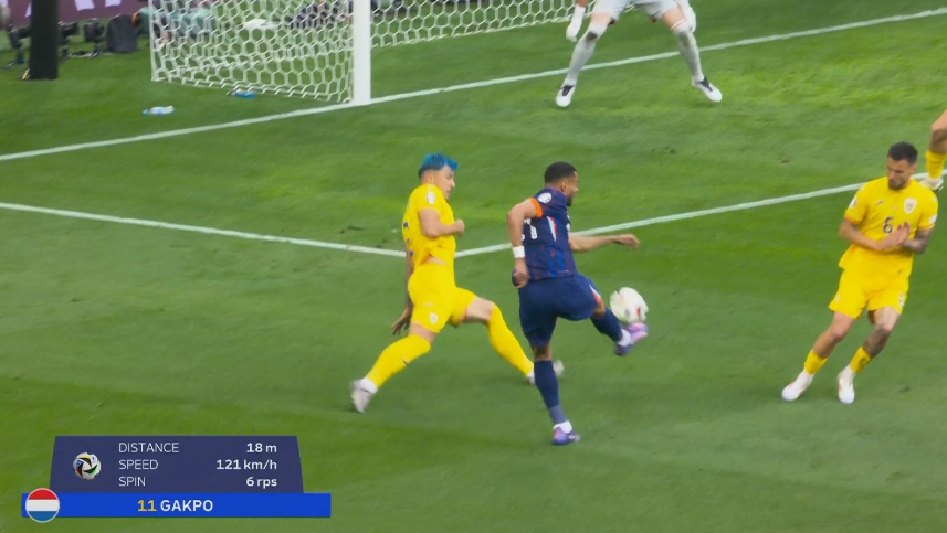07月03日讯 欧洲杯1/8决赛,罗马尼亚vs荷兰。比赛第20分钟,加克波禁区左侧内切小角度爆射近角破门!荷兰1-0领先罗马尼亚。据数据显示,加克波射门时距离球门18m,球速达到121km/h。