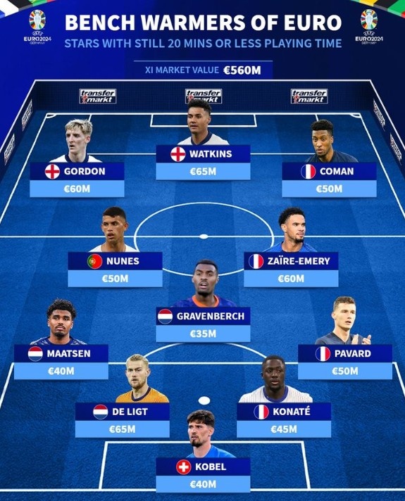 7月5日讯 欧洲杯已经进入八强战阶段,但多位名将仍然没有获得多少出场时间,《转会市场》便列出了本届欧洲杯“铁板凳”最佳阵。