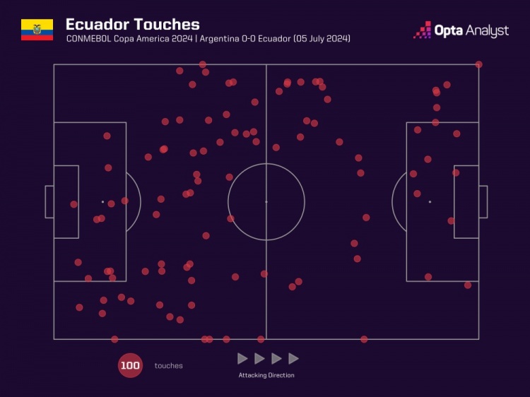 比赛开场前15分钟厄瓜多尔禁区内触球8次,阿根廷0次