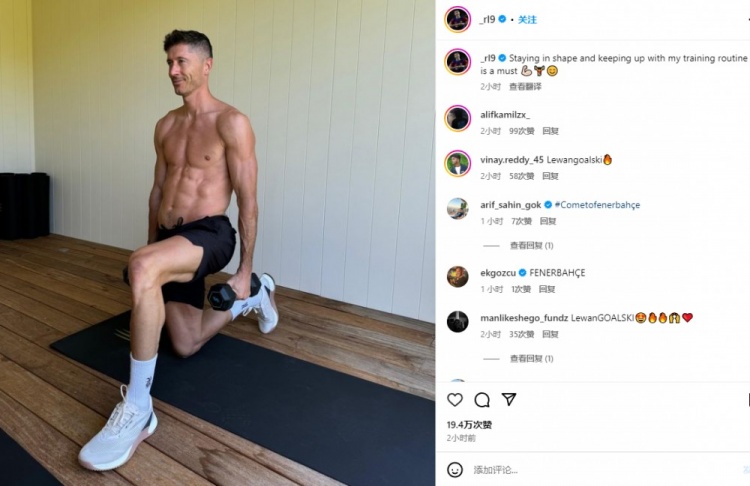 莱万在社媒晒出了自己进行健身训练的照片,肌肉线条明显,他也配文道:“保持好身材,并坚持日常训练是必须要做的。”