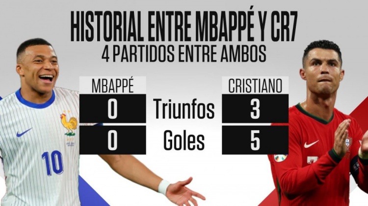 7月6日讯 欧洲杯1/4决赛 葡萄牙点球大战不敌法国,止步8强。这场比赛是姆巴佩与C罗第5次交手,他仍未取得进球。(点球大战通常记为平局)C罗、姆巴佩此前4次交手