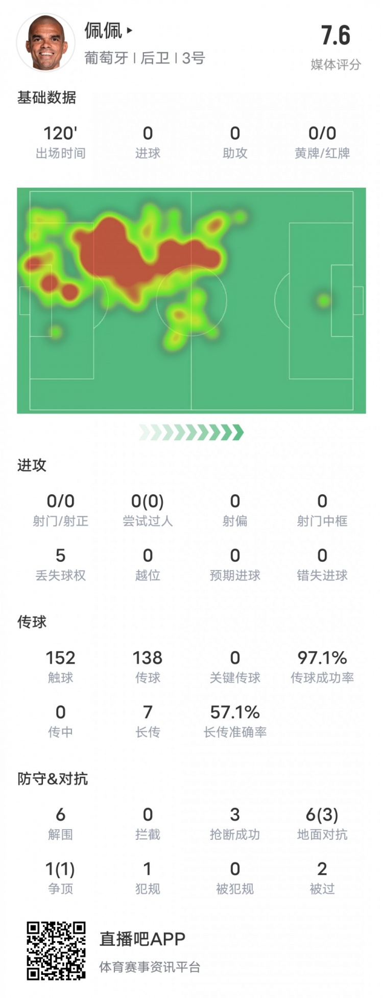 佩佩本场比赛数据:6解围3抢断&传球成功率97.1%,评分7.6
