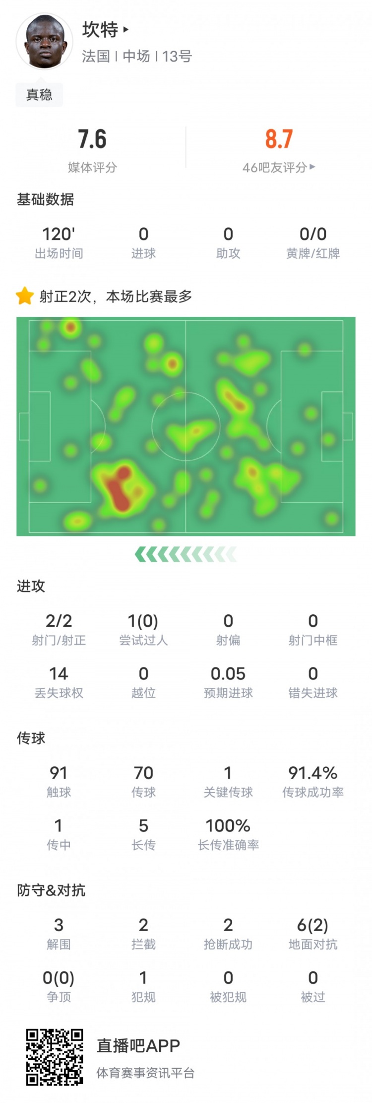 坎特本场比赛数据:1关键传球3解围2拦截2抢断,评分7.6