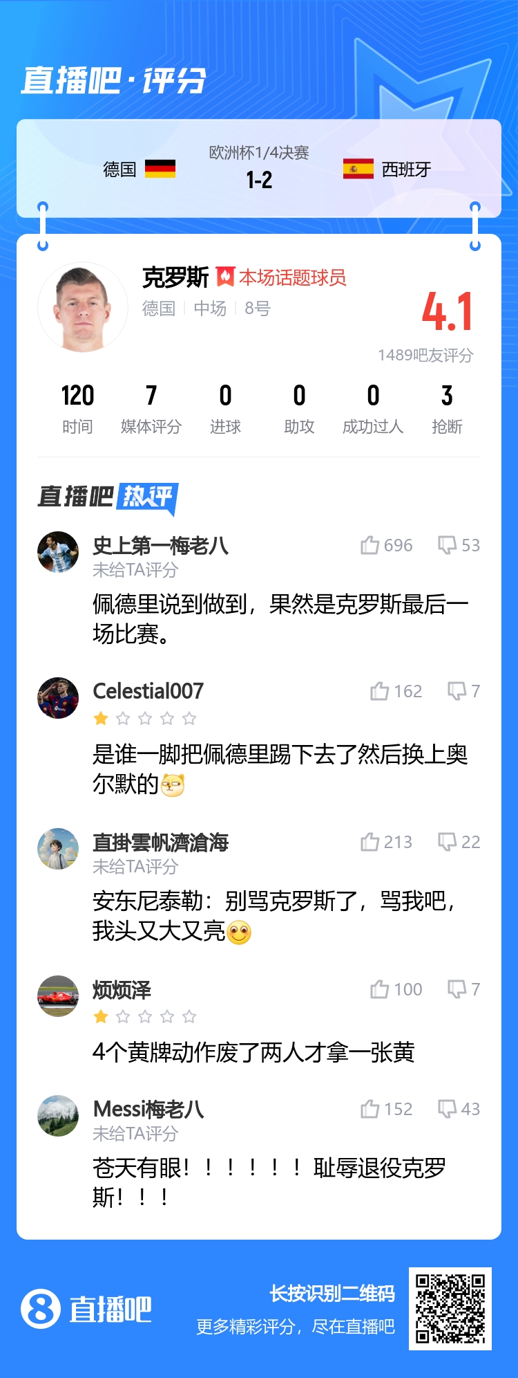 晚节不保吧友评克罗斯:耻辱退役!废了2个人才拿一张黄牌!