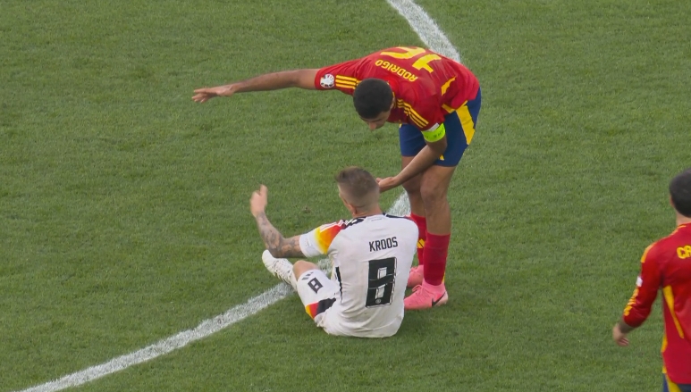 07月06日讯 西班牙vs德国加时赛下半场,34岁克罗斯坐在地上,接受队医进场治疗。目前德国已经用完全部换人名额!
