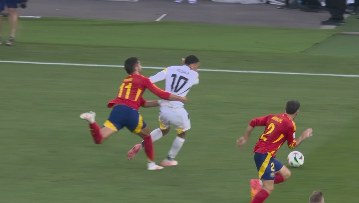 07月06日讯 西班牙vs德国第75分钟,费兰飞扑阻止穆西亚拉反击,战术犯规染黄!