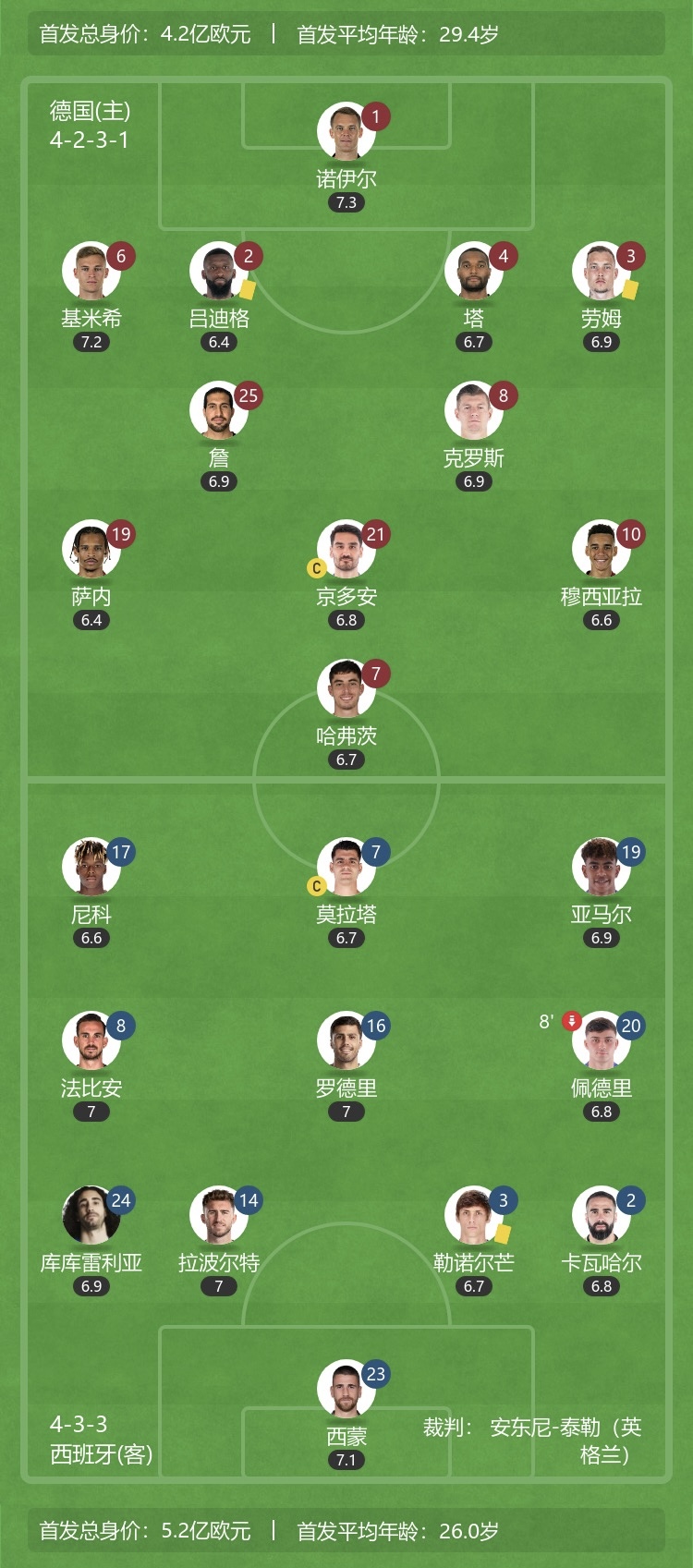 07月06日讯 欧洲杯1/4决赛,西班牙vs德国。上半场双方0-0平,两队球员半场评分如下。
