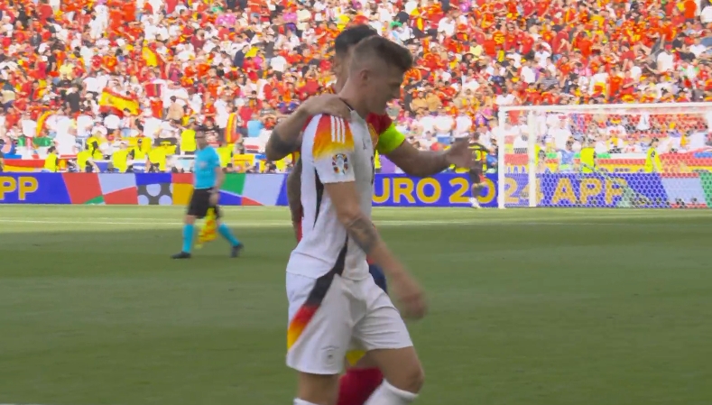 07月06日讯 欧洲杯1/4决赛,西班牙vs德国,上半场结束双方战成0-0,半场结束后,莫拉塔搭着克罗斯的肩膀与之交流。