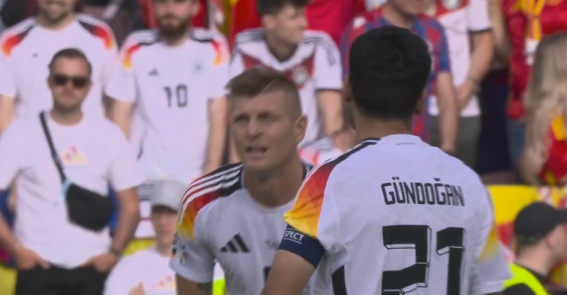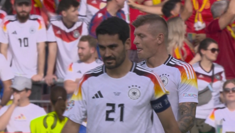 07月06日讯 欧洲杯1/4决赛,西班牙vs德国,比赛第51分钟,奥尔莫破门,西班牙1-0领先德国,丢球后的京多安和克罗斯一脸无奈。
