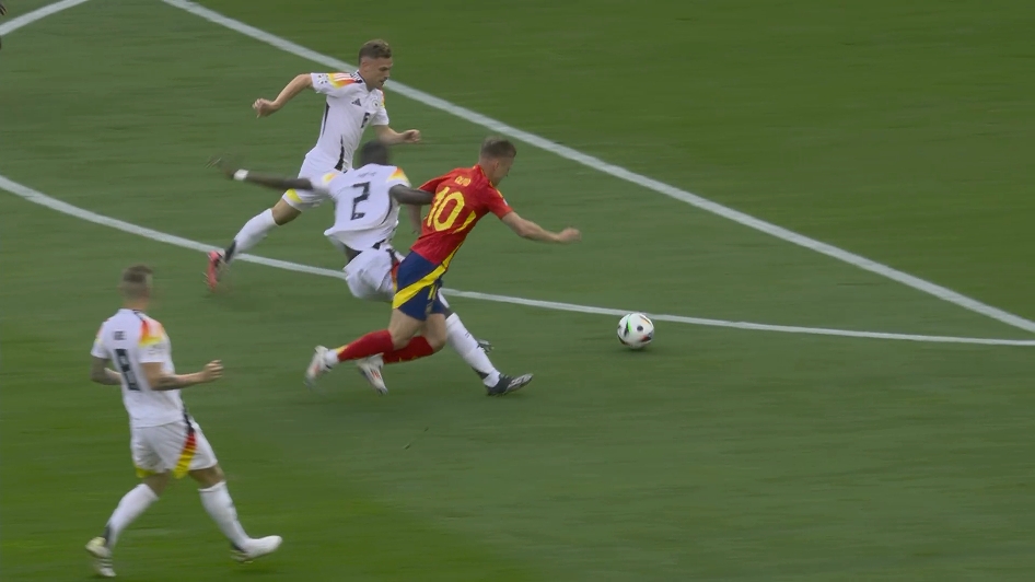 07月06日讯 欧洲杯8强战,西班牙vs德国。比赛第14分钟,德国中卫吕迪格放倒奥尔莫,吃到黄牌,若德国晋级半决赛,吕迪格将因累计黄牌缺席半决赛。