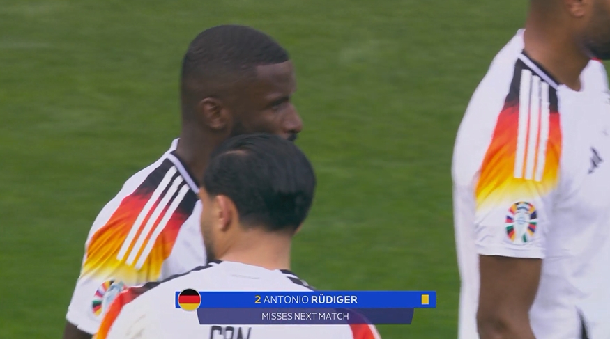 比赛第14分钟,德国中卫吕迪格放倒奥尔莫,吃到黄牌,若德国晋级半决赛,吕迪格将因累计黄牌缺席半决赛。
