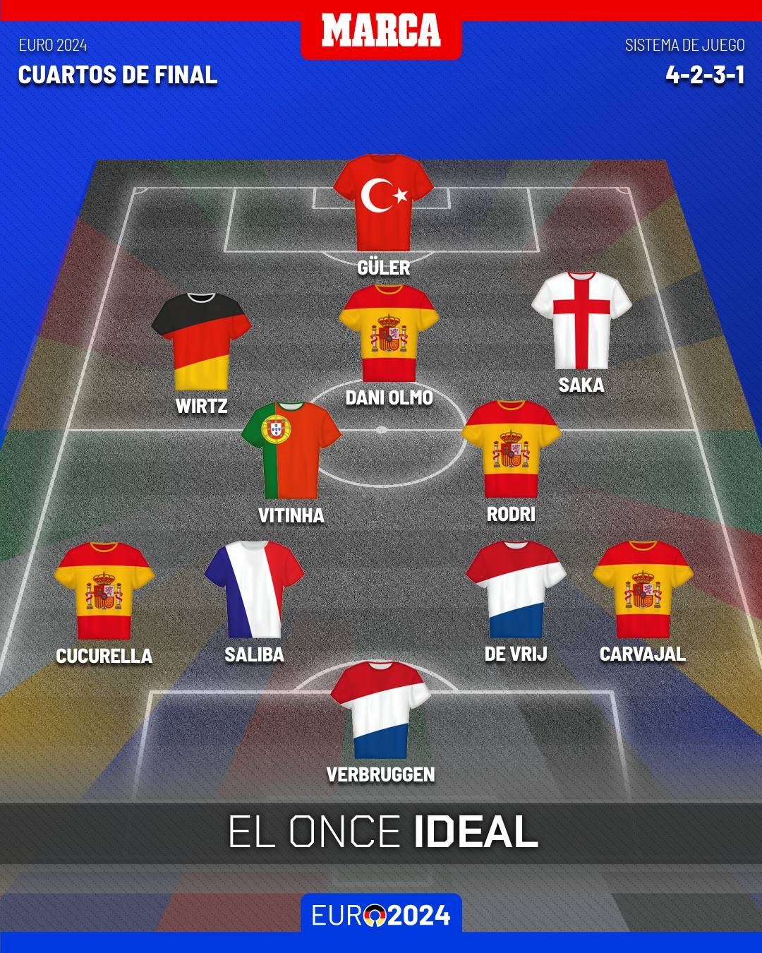 马卡报列出他们评选的1/4决赛最佳阵容,选取的阵型为4-2-3-1,西班牙4人入选,居勒尔、维尔茨在列,具体如下。