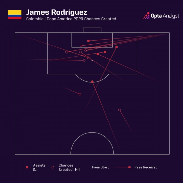J罗创造14次机会中的10次来自定位球,他定位球创造机会的次数占比本届赛事所有球员的13.7%。