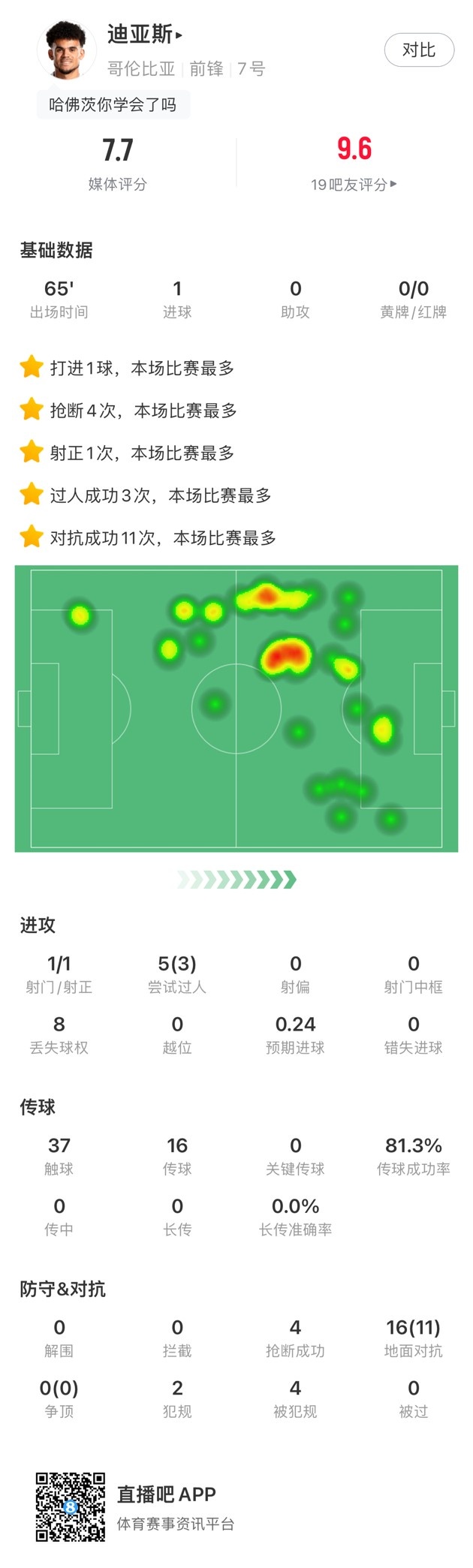 迪亚斯全场数据:评分7.7分全场第二,抢断数等5项数据为全场之最