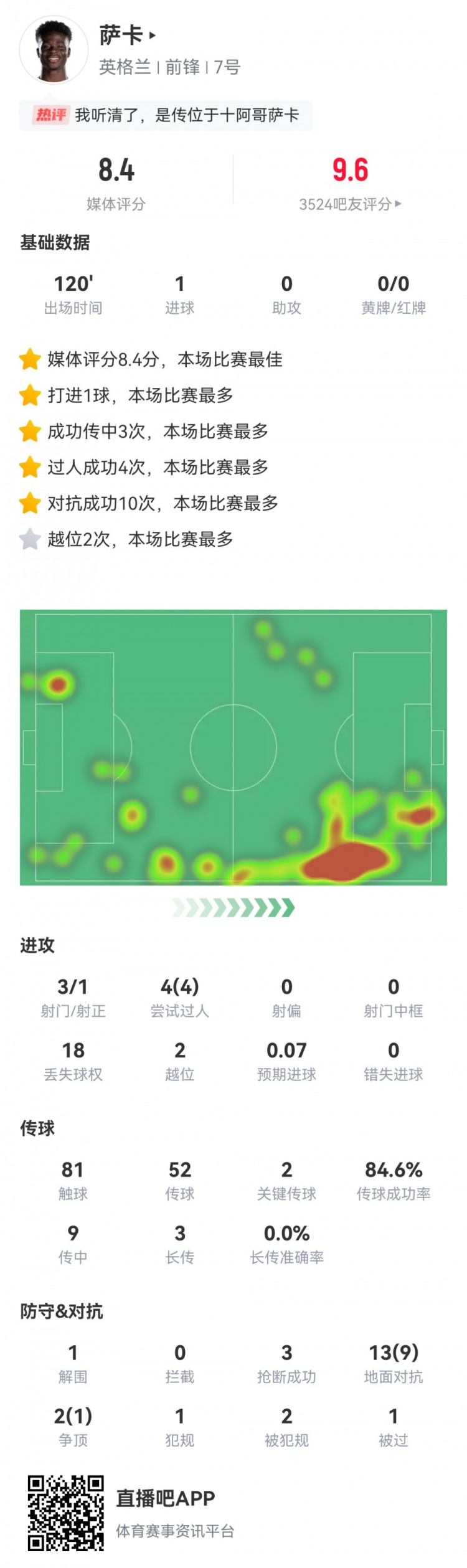 相关阅读:萨卡数据:3射1正1进球,2次关键传球,4次过人,全场最高8.4分