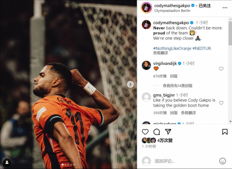 7月7日讯 欧洲杯1/4决赛,荷兰2-1逆转土耳其晋级四强。赛后,此役造乌龙制胜的加克波晒照庆祝胜利,并配文:永不退缩。我为我们的团队感到无比自豪