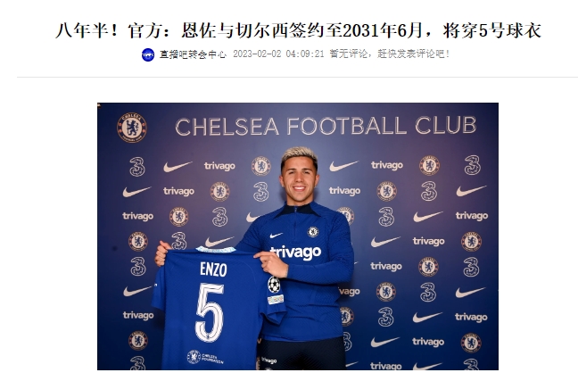 2023年2月,切尔西以高达1.21亿欧签恩佐,后者成为英超历史标王。恩佐的合同八年半,2031年6月到期。