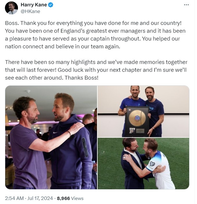 凯恩:“感谢你为我和我们国家所做的一切!你是英格兰历史上最伟大的教练之一,一直担任你的队长是我的荣幸。你帮助我们的国家紧密联系起来,重新信任我们的团队。