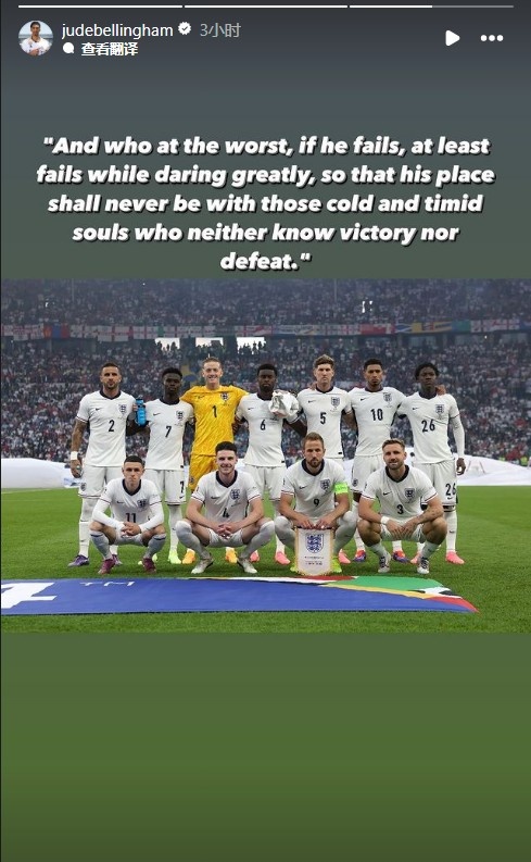 贝林厄姆晒出了英格兰的首发11人合照,并且在配文中引用了罗斯福的名言:“即使失败,至少也是在大胆尝试中失败。