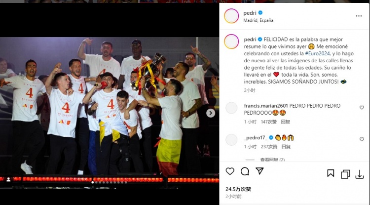 7月16日讯 本届欧洲杯决赛,西班牙2-1战胜英格兰夺冠。佩德里也更新了社媒动态谈到了参加完夺冠庆典后。