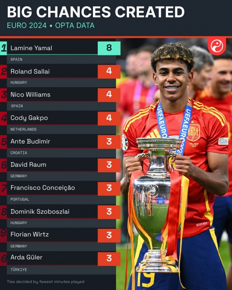 据Squawka统计,亚马尔本届欧洲杯创造8次重大机会,他是这项赛事历史上首位单届创造重大机会超过6次的球员。