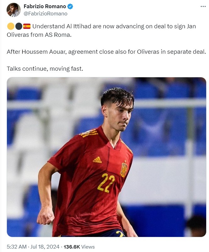 7月18日讯 罗马诺的消息,吉达联合正在推进从罗马签下20岁边卫奥利维拉斯。