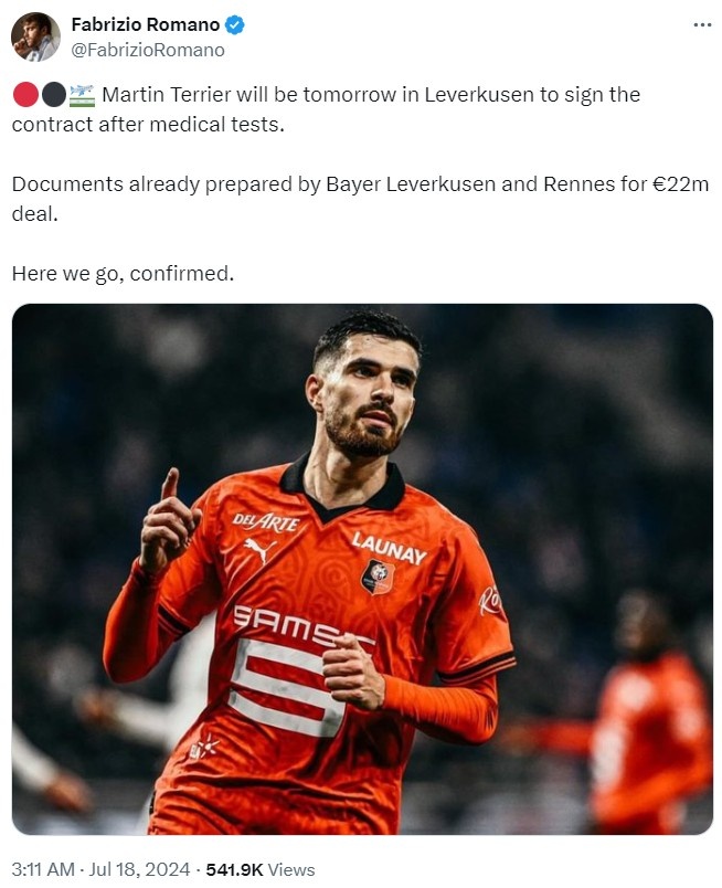 7月18日讯 罗马诺以标志性的Here we go报道称,雷恩攻击手将在明天在勒沃库森接受体检后签署合同。这笔交易的转会费2200万欧,两家俱乐部已经准备好了文件。