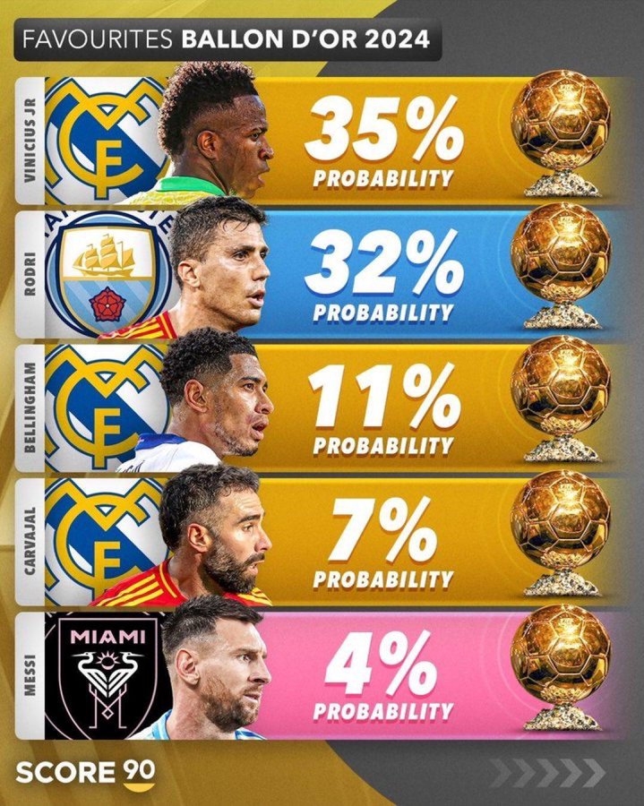 金球奖概率:维尼修斯、罗德里大热门 贝林、卡瓦哈尔、梅西前五
