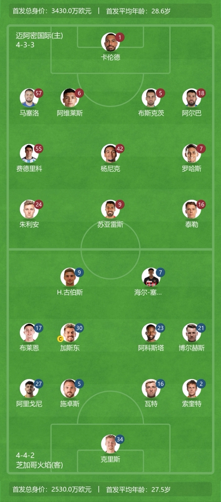 07月21日讯 美职联第27轮 迈阿密国际vs芝加哥火焰,赛前首发名单公布。