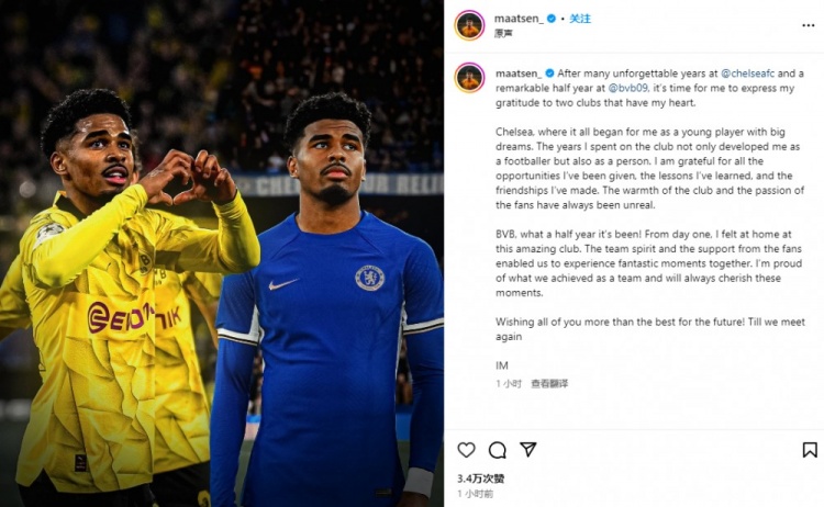 马特森表示:“在切尔西经历了许多难忘的岁月,并在多特度过非凡的半年之后,我需要向两家心之所向的俱乐部表达感激之情。”