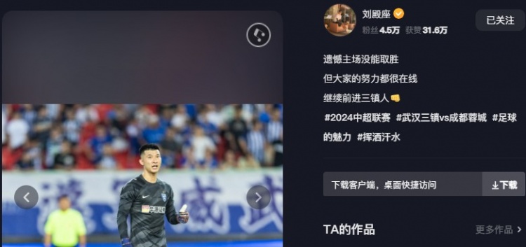 7月21日讯 中超第24轮,武汉三镇1-1成都蓉城,此役,武汉三镇门将刘殿座首发出场。赛后,刘殿座在社媒发文:“遗憾主场没能取胜,但大家的努力都很在线,继续前进三镇人