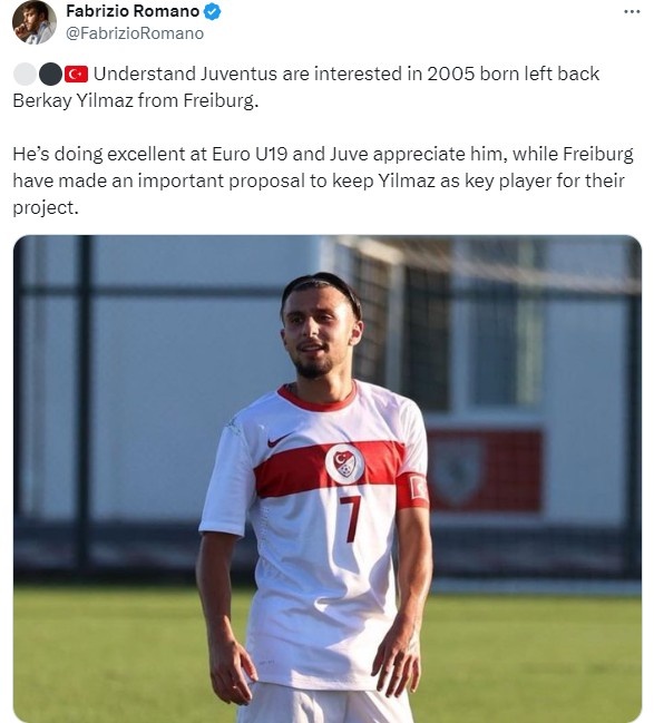 该记者透露:“尤文对于弗赖堡的19岁左后卫贝尔凯-伊尔马兹很感兴趣。贝尔凯在U19欧青赛表现出色,也得到了尤文的青睐。”