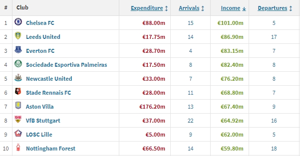夏窗卖人收入排行:切尔西1.01亿欧领跑,利兹联第二、埃弗顿第三