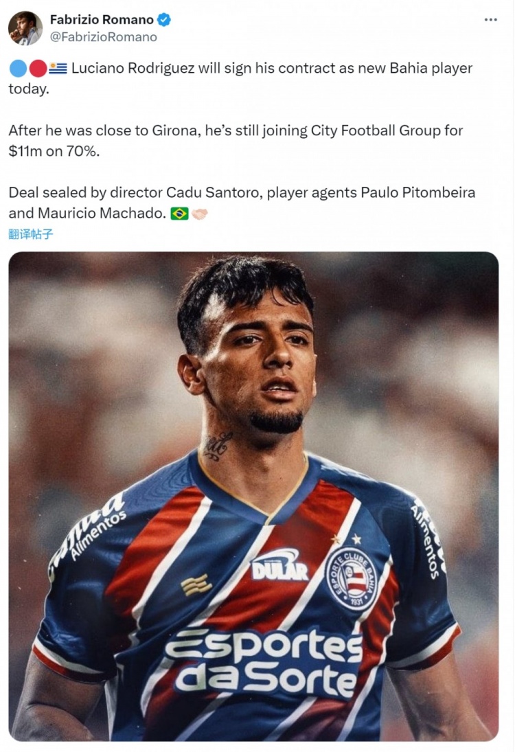 罗马诺指出,蒙得维的亚利物浦21岁边锋卢西亚诺-罗德里格斯曾一度接近加盟赫罗纳,现在他将转会至与赫罗纳同属城市足球集团的巴甲俱乐部巴伊亚竞技,双方将在今天签署合同。巴伊亚竞技以1100万美元的价格购买卢西亚诺-罗德里格斯70%的所有权。