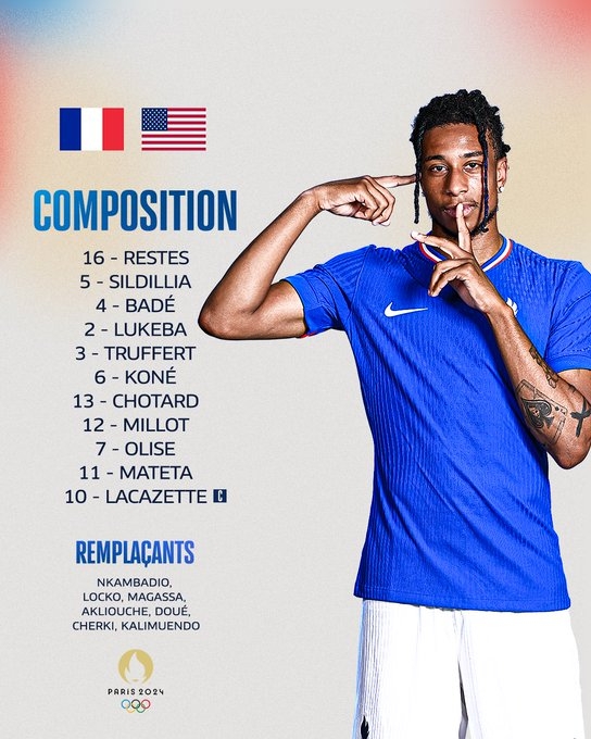 7月25日讯 奥运男足小组赛A组第1轮,U23法国对阵美国U23。赛前,官方公布了本场的首发。法国U23首发:16-雷斯特、5-西尔迪西亚、4-巴代、2-卢克巴、3-特鲁弗尔