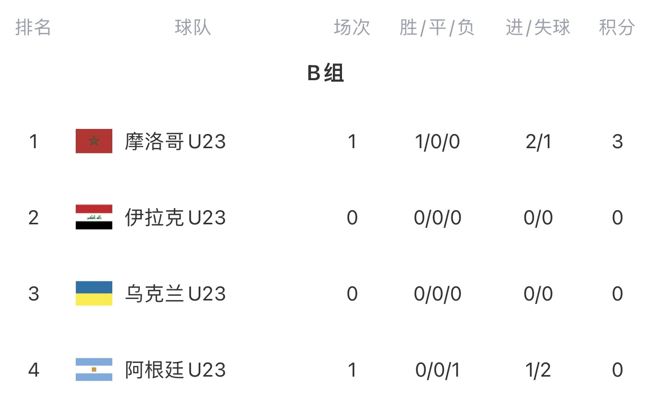 真·奥运男足B组积分榜:摩洛哥3分头名,阿根廷0分暂垫底
