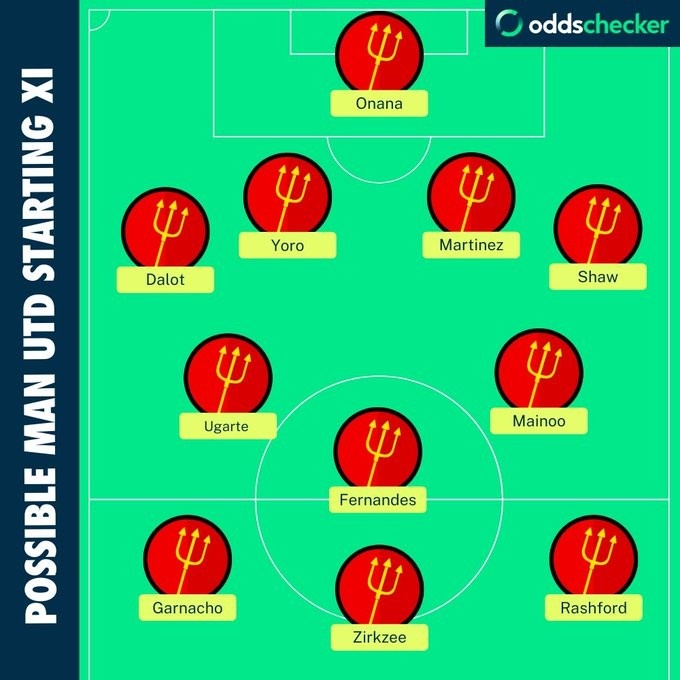 7月25日讯 曼联在今夏已经连续引进强援,外媒《oddschecker》也预测了红魔新赛季首发情况。阵型433门将:奥纳纳后卫:达洛特、约罗、利桑德罗、卢克-肖中场:乌加