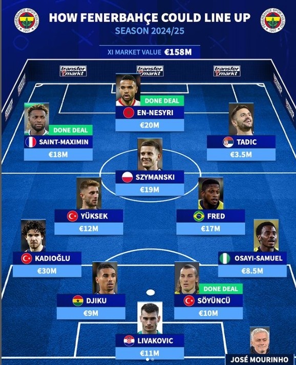 7月26日讯 费内巴切在此前已经签下了塞维利亚中锋恩内斯里,《转会市场》也预测了穆帅可能在新赛季排出的主力阵容。