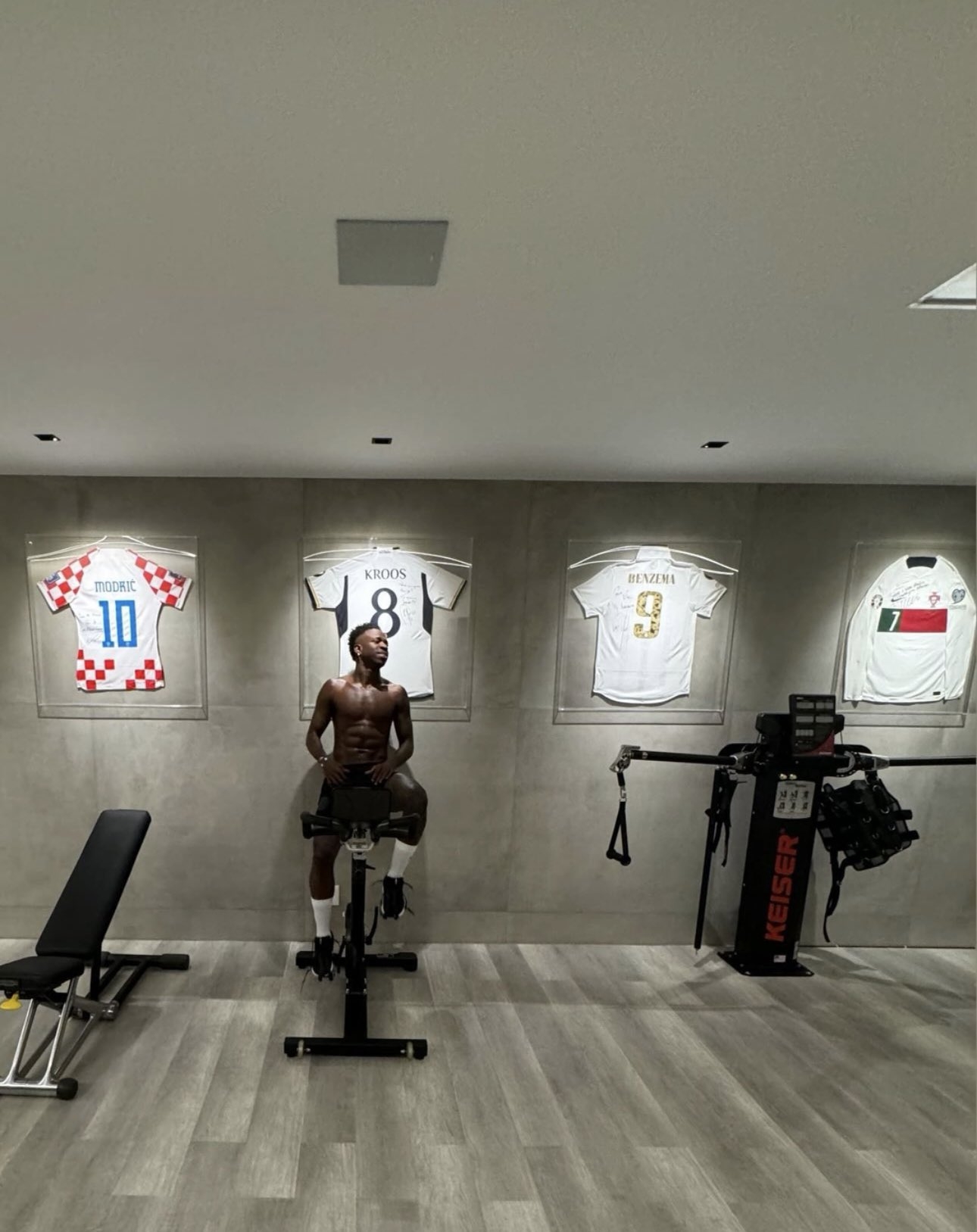 维尼修斯晒出了在自己私人健身房的锻炼照,墙上挂着C罗、莫德里奇等人的球衣。