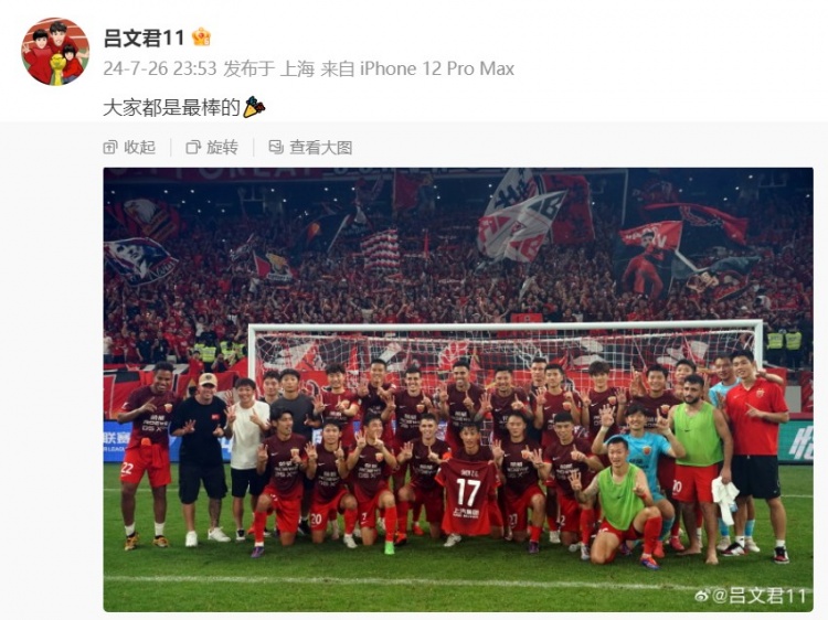 赛后,海港球员吕文君在个人微博中晒出全队合照,并写道:大家都是最棒的