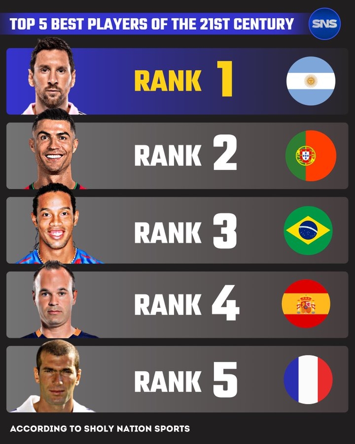 外媒评21世纪十大球星:梅罗前二 小罗第三、齐祖第五、大罗第六