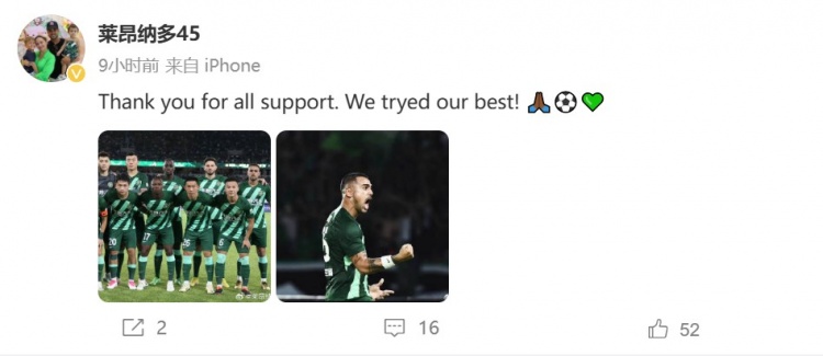 赛后,莱昂纳多晒出本场比赛照片,他同时配文:“感谢大家的支持,我们拼尽全力了!