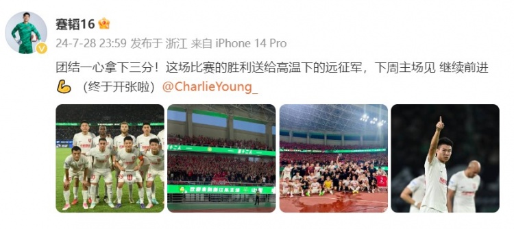 7月29日讯 中超联赛第20轮,成都蓉城客场3-1击败浙江队。赛后,蓉城门将蹇韬发文庆祝胜利。