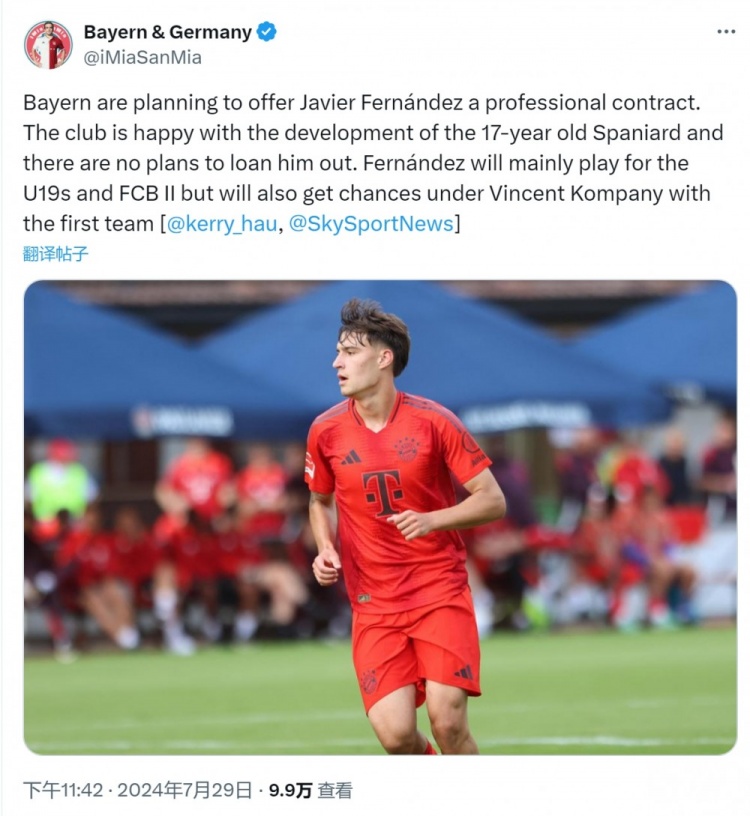 7月30日讯 据德国天空体育透露,拜仁计划为哈维尔-费尔南德斯提供一份职业合同。媒体指出,拜仁对17岁西班牙中场费尔南德斯的发展感到满意,计划为其提供一份职