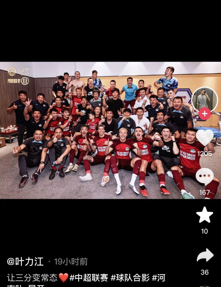 7月30日讯 在河南队主场1-0击败山东泰山后,叶力江在社媒发文进行了庆祝。